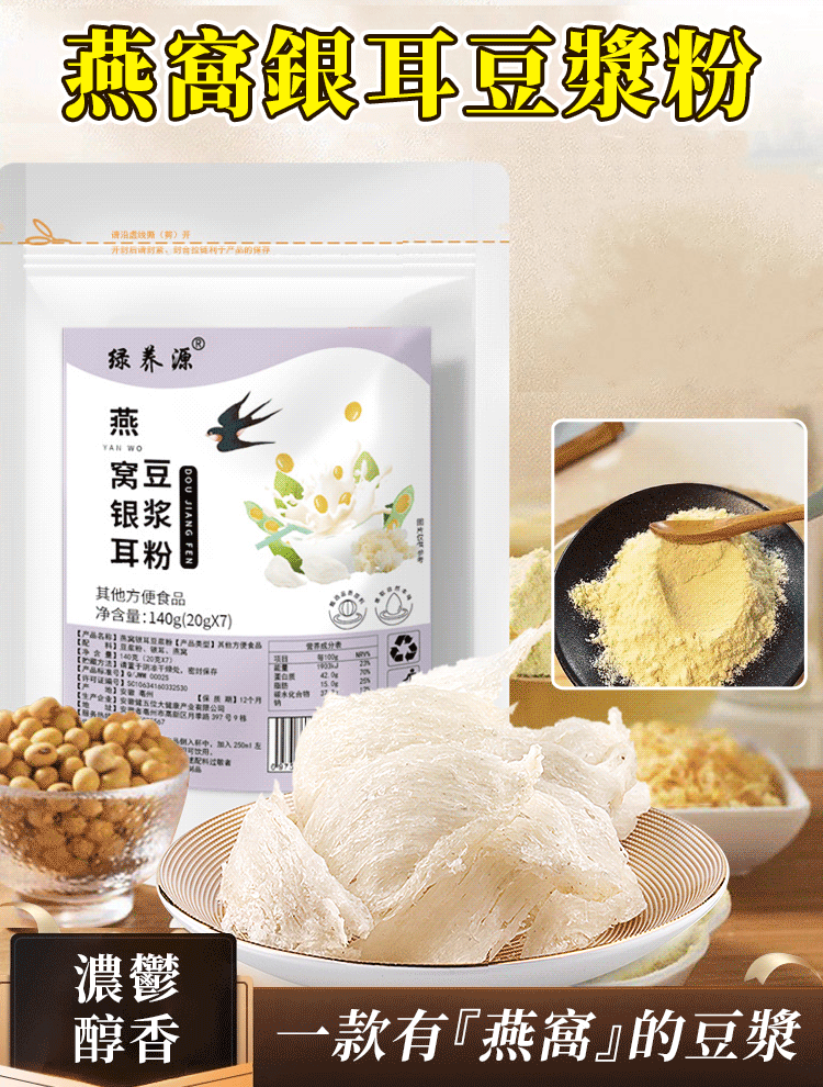 「喚醒美麗,啜飲天然的奢華」燕窩銀耳豆漿粉 每一杯燕窩銀耳豆漿,美味可口又方便,均衡的營養配比,不僅使您的皮膚得到深層滋養,還有助於減淡色斑,恢復皮膚自然光采!